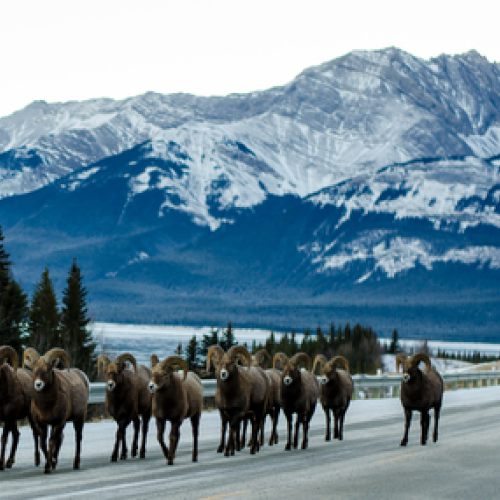 As I drove across the highway one evening to catch a glimpse of the sunset by the lake, a herd of mountain goats were on a journey of their own through the Rocky Mountains near Abraham Lake, Canada.