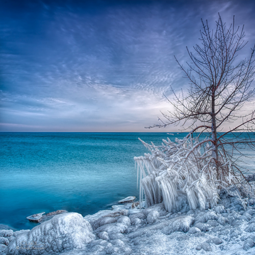 The winds coming off Lake Ontario deposited layers of ice along the shoreline. The early morning light streaked across the clouds.