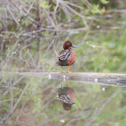 A Cinnamon Teal perched on a log in Kelowna, BC
