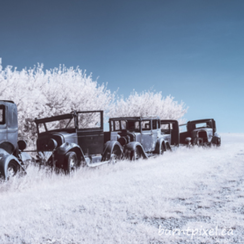 I found this old truck behind a ruin of a stone church in the far southwest corner of Manitoba near the U.S. border. I believe this is Copley Anglican Church. You can't go wrong with an infrared shot when you have subjects like these.